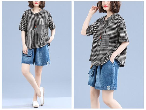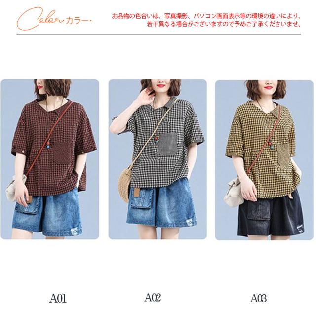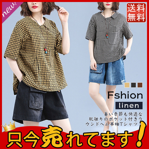 ブラウス トップス チュニック レディース チェック柄 リネン シャツ 春 夏 ゆったり 体型カバー ラウンドネック シンプル 送料無料