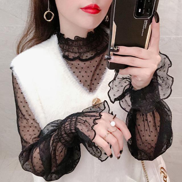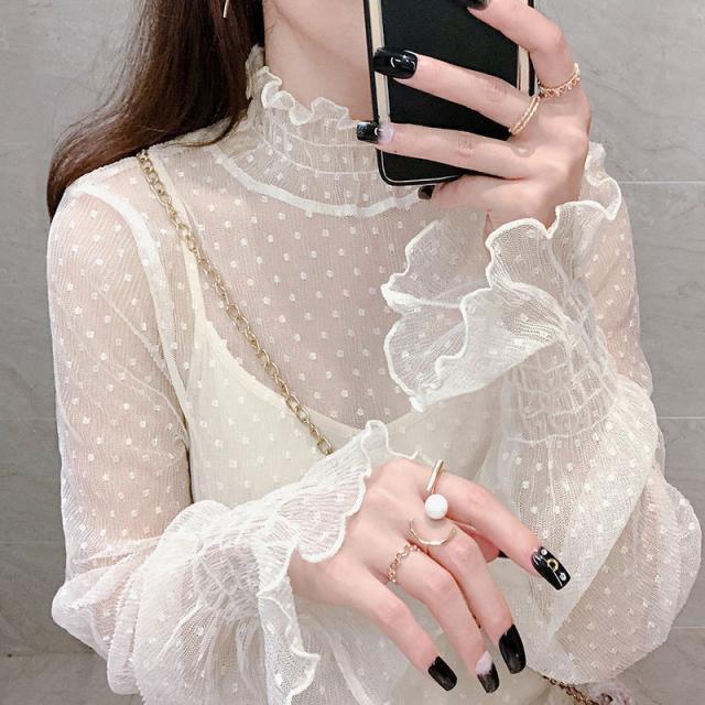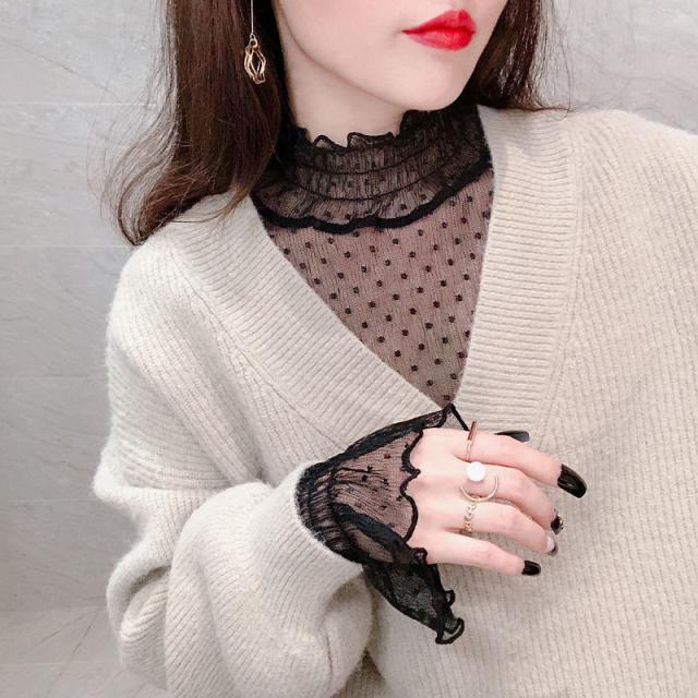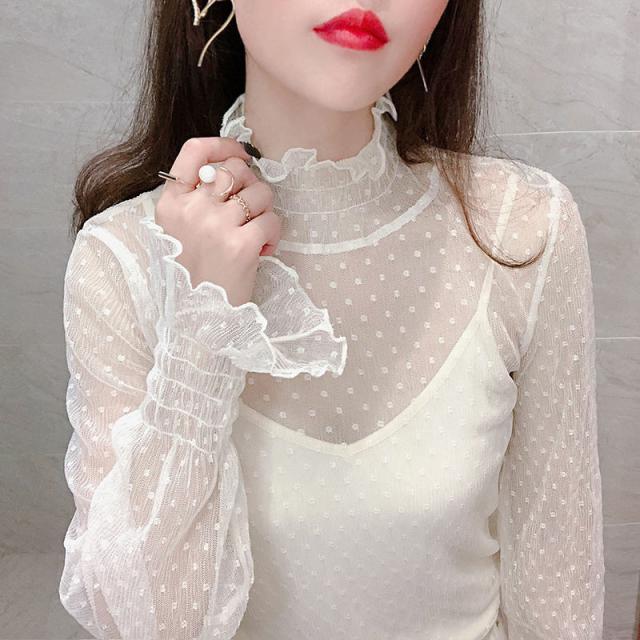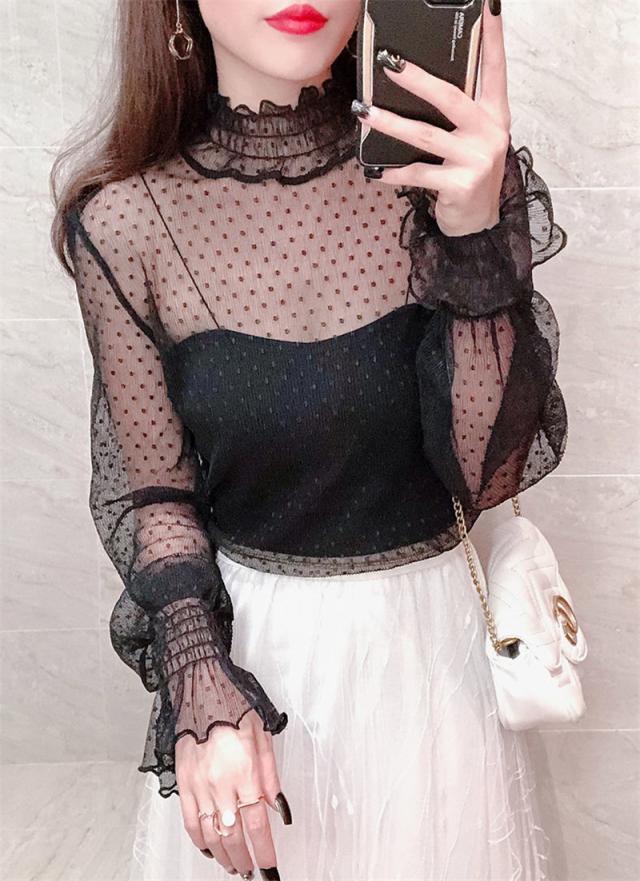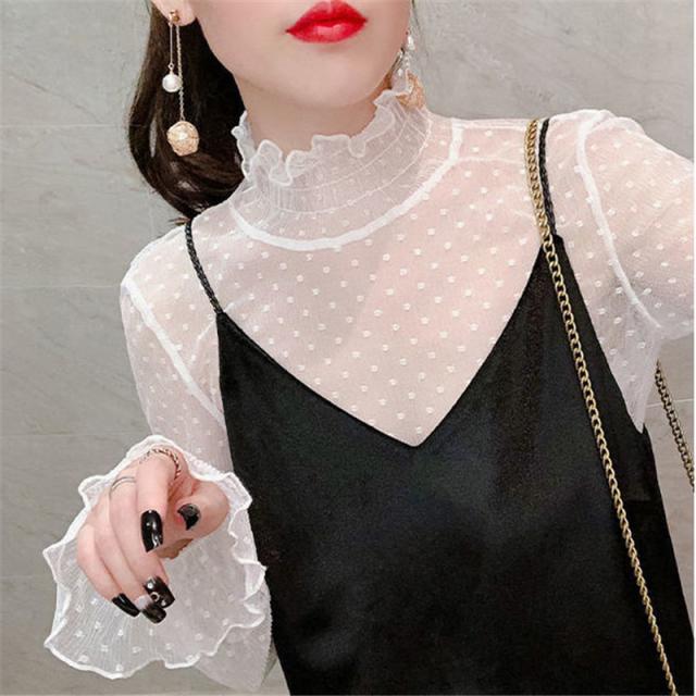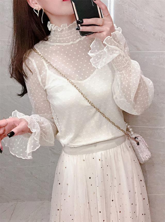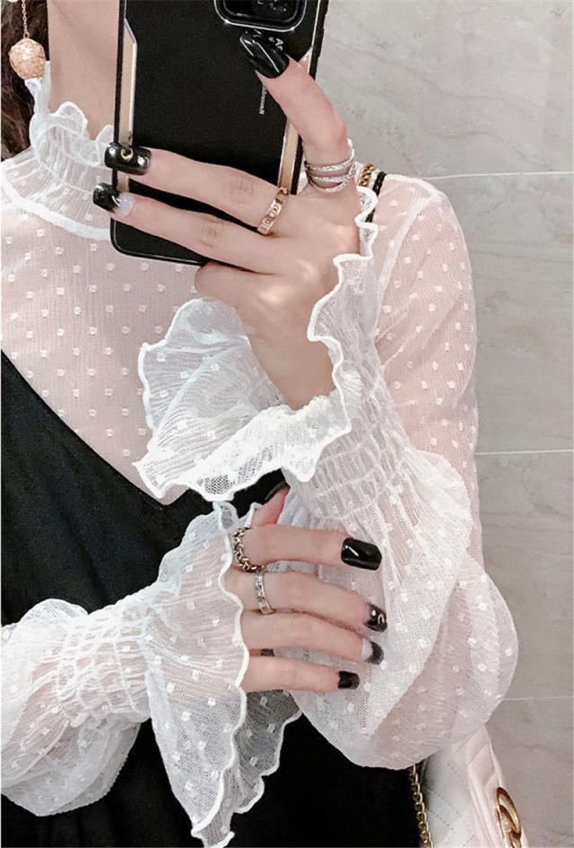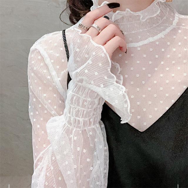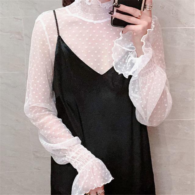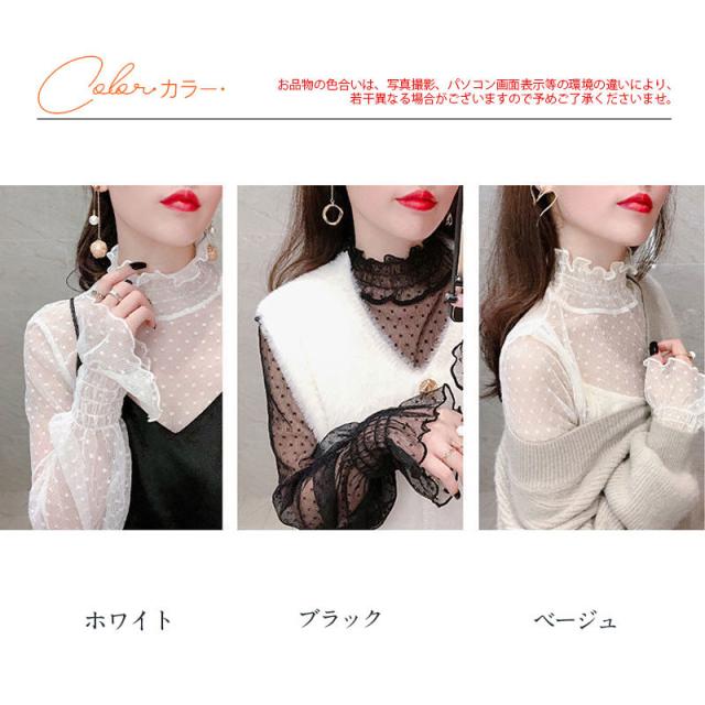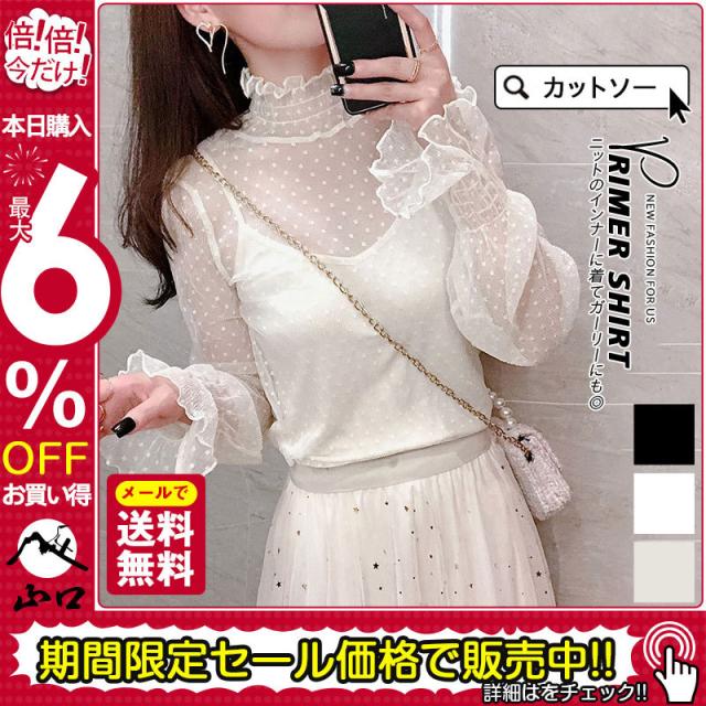 カットソー Tシャツ レディース インナー 長袖 透け感 春秋 フリル おしゃれ シンプル 細身 トップス 無地 送料無料 ハイネック 薄手 ストレッチ