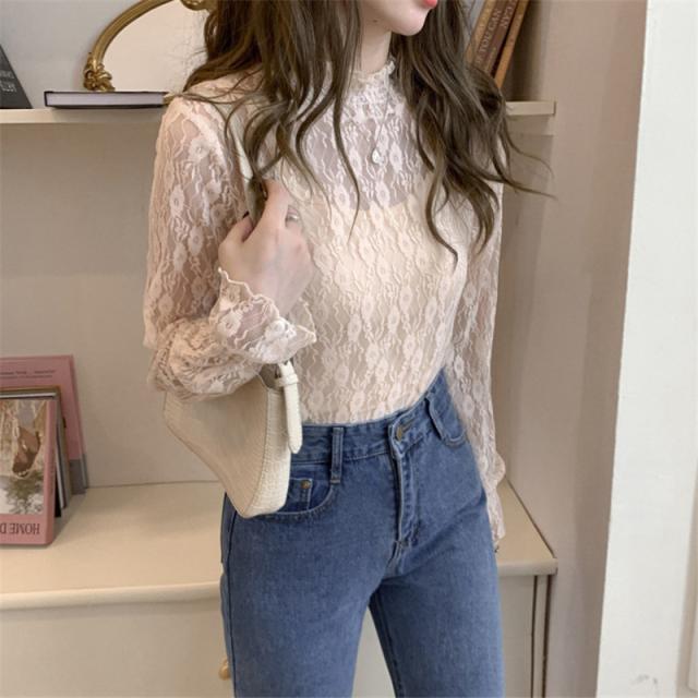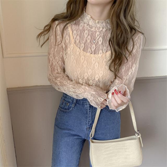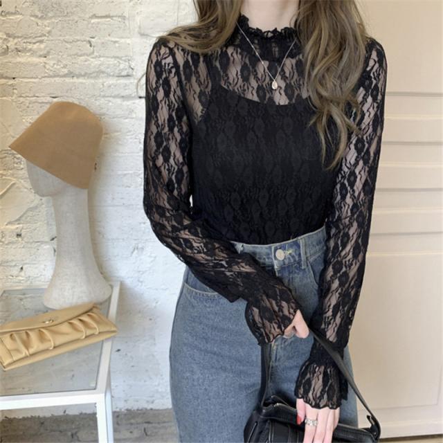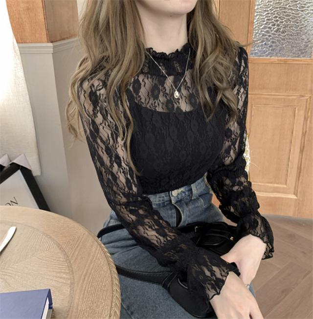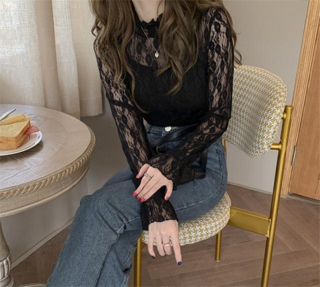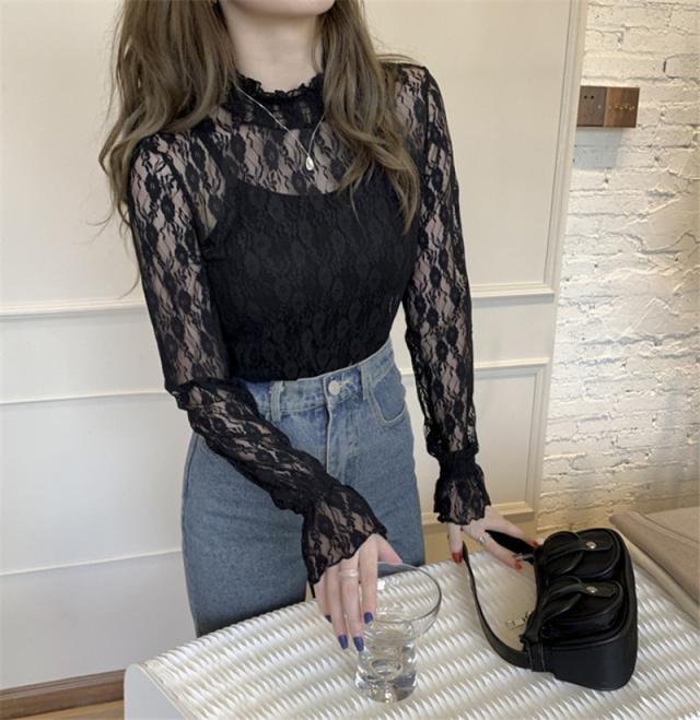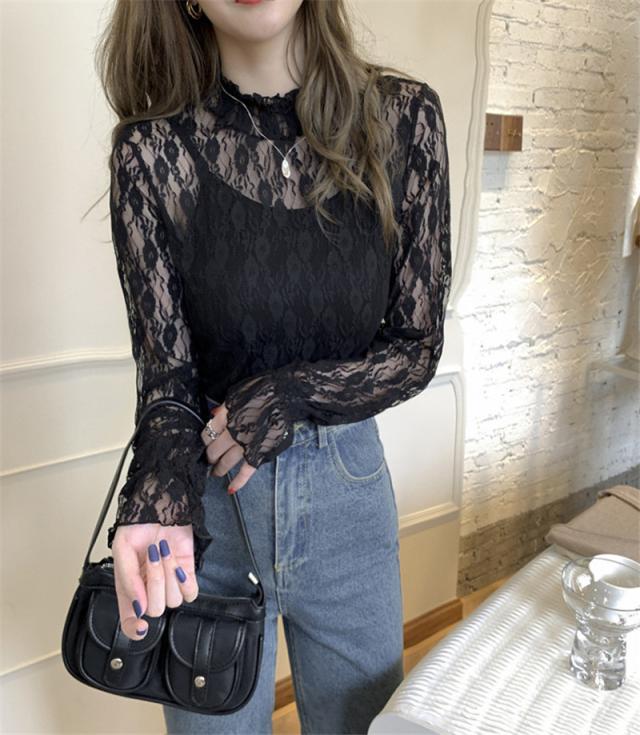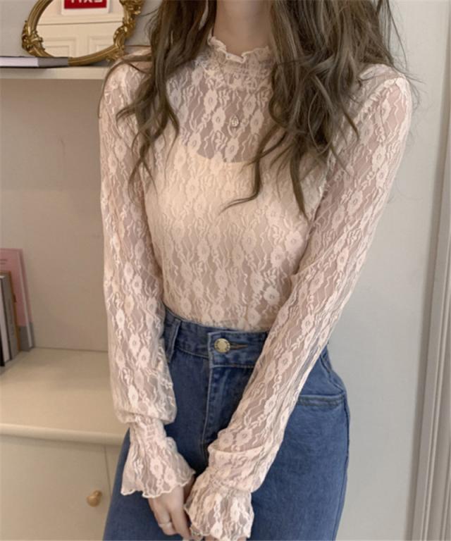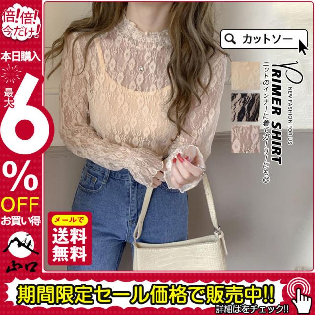 カットソー Tシャツ レディース インナー 長袖 透け感 春秋 フリル おしゃれ 花柄レース 細身 トップス 送料無料 ハイネック 薄手 ストレッチ