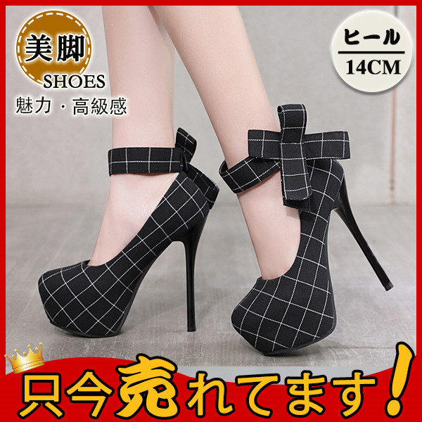 ハイヒール 超ハイヒール チェック柄 おしゃれ リボン レディース 前厚 キャバ 細身ヒール パーティー 痛くない 美脚 シューズ 二次会 14cm