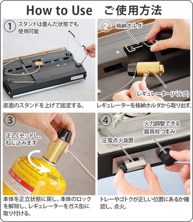 圧電式点火装置が装備されており、ライターいらずでカンタン着火。さらにガスの流量を調節してくれるレギュレーターが付いているため、点火した後は長時間使用しても、火力が落ちることはありません。2口のバーナーはOD缶1つに対し個別に使用でき、1度に2種の調理をすることが可能です。