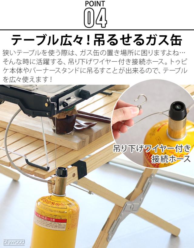 コンパクトで軽量、薄型で持ち運びに便利な2口ガスストーブ「トゥピケ」。天板とハンドルにウッドをあしらったデザインは、自然に溶け込みキャンプサイトをオシャレに彩ります。接続ホースでOD缶を繋いで使用するタイプで、テーブルの上でも圧迫感無く、スッキリと使用することができます。持ち手は天板を閉じた後、手前に倒すことにより自動でロックがかかるセルフロッキング機能なので、持ち運び中に勝手に開く事もなく安心です。持ち運びや車への積み下ろしにも適しています。