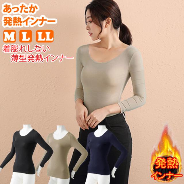 【メール便送料無料】発熱 あったか 着膨れなし インナー 肌着 レディース 長袖 丸首 薄手 防寒 黒 暖かい 冬 秋 吸湿 冷え対策 ムレにくい M L LL ポイント消化