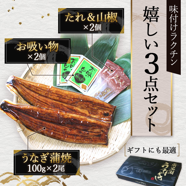 商品名 浜松・浜名湖うなぎ 蒲焼セット 2人前(100g×2尾) 容量 うなぎ蒲焼(100g)×2袋、たれ山椒(たれ10ml 山椒0.2g)×2袋、粉末吸物(3.7g)×2袋 原材料名 うなぎ蒲焼:うなぎ(浜名湖産)、さい仕込み醤油、砂糖、味醂、澱粉、清酒(一部に小麦・大豆を含む)