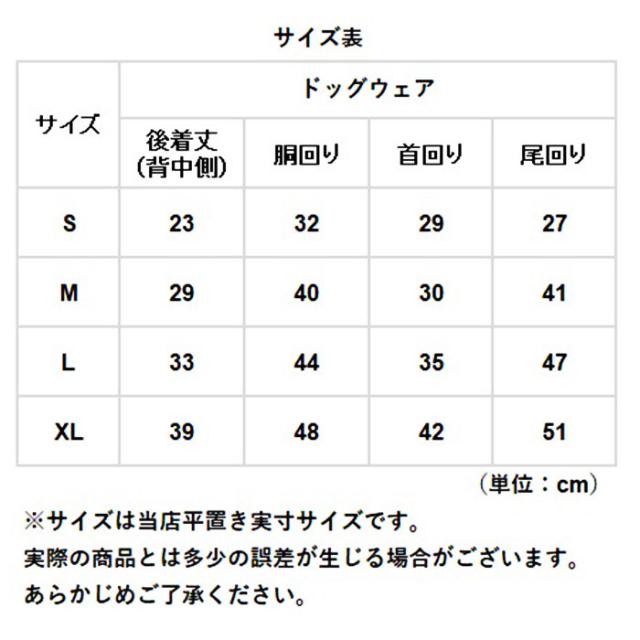 | サイズ | 【ドッグウェア】 ・Sサイズ ・Mサイズ ・Lサイズ ・XLサイズ ※サイズについて詳細は、サイズ表をご覧ください。 |