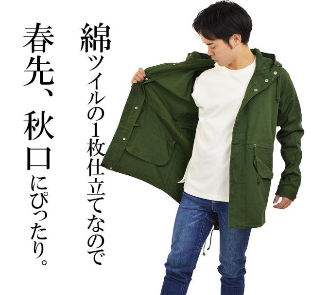 ■当商品は、綿ツイルにストレッチ(伸縮性)を加え、裏地なしの1枚仕立てなので春先、秋口からサッと羽織れるモッズコートです。