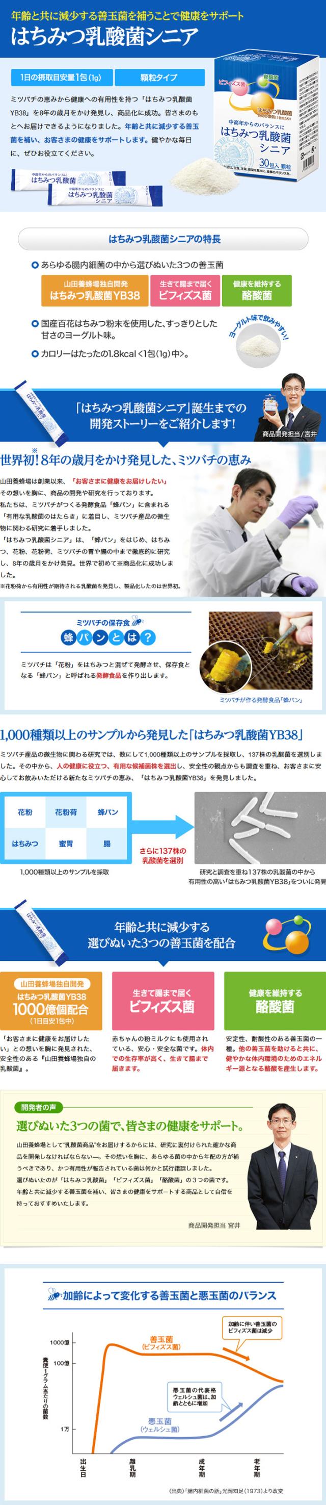 乳酸菌研究の成果である“はちみつ乳酸菌 YB38”に、年齢とともに減少する善玉菌であるビフィズス菌と酪酸菌を加え、中高年の方の健康のサポートを考えて開発した、飲みやすい顆粒タイプ(ヨーグルト味)の商品です。