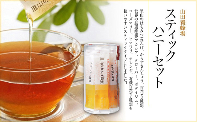 里山のはちみつ(れんげ、からすさんしょう、百花)3種類、世界の厳選蜂蜜(アカシア、クローバー、ボダイジュ、ローズマリー、ヒマワリ、オレンジ、有機百花)7種類を使いやすいスティックタイプにしました。