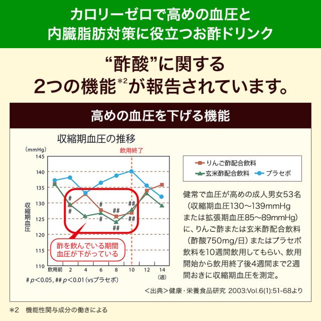 届出表示:本品には酢酸が含まれます。酢酸には血圧が高めの方の血圧を下げる機能があることが報告されています。
