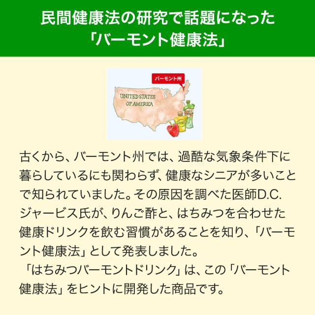はちみつを酢酸発酵させて作った「はちみつ酢」を、アメリカ・バーモント州の「バーモント健康法」からヒントを得て、お酢ドリンクにしました。はちみつ酢とりんご果汁で飲みやすくまろやかな味わいに仕上げました。持ち運びに便利な、手軽にお酢が摂れるストレートタイプです。