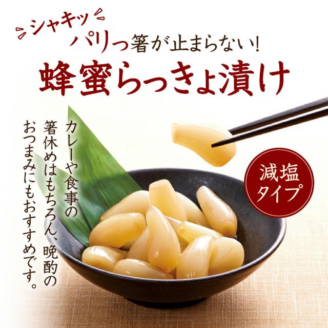 | 商品説明 | 国産らっきょうを使用し、シャキっとした歯ざわりと、甘酸っぱさで食が進みます。 従来品に比べ、食塩相当量を40%カットした《減塩タイプ》です。 飽きのこない上品な味わいをお楽しみください。 |