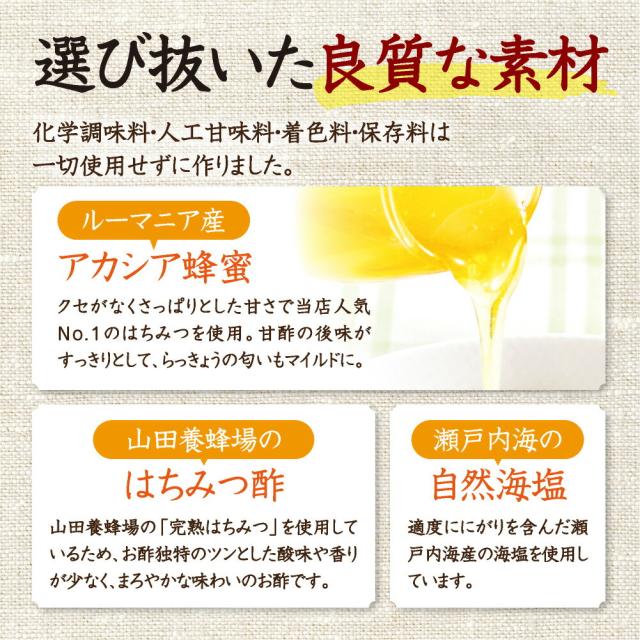 | 原材料名/原料/原産国(加工地) | らっきょう / らっきょう / 日本 砂糖 / さとうきび、てん菜 / タイ、日本他 醸造酢 / はちみつ、アルコール / キューバ、日本 はちみつ / はちみつ / ルーマニア 食塩 / 海水 / 日本 ・水産物などを由来とする原料について、由来となる農水産名とその原産地を表示しております。加工地は、原料が製造された国または地域を表示しております。 ・天候などの影響により、表記原産地から調達できない場合は、その他の産地のものを使用する場合がございます。 ・原材料名は、JAS法に従った順序で記載しております。 |