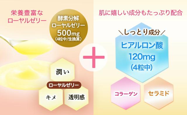 ローヤルゼリーの美容成分を「飲んで」内側から美しさを底上げ。乾燥に悩んでいる人におすすめの美容サプリメントです。美容成分の宝庫ローヤルゼリー500mgをはじめ、高い水分力を持つヒアルロン酸を配合。毎日続けやすい錠剤タイプ。
