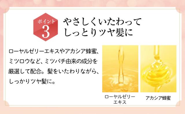 ・ローヤルゼリーエキス、ハチミツ配合でしっとりツヤ髪に導きます。