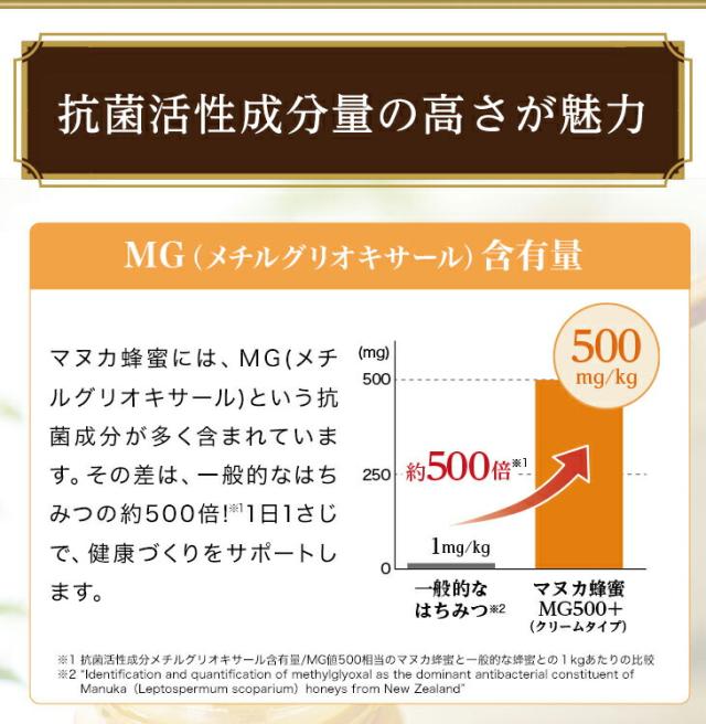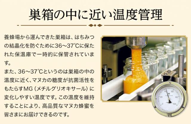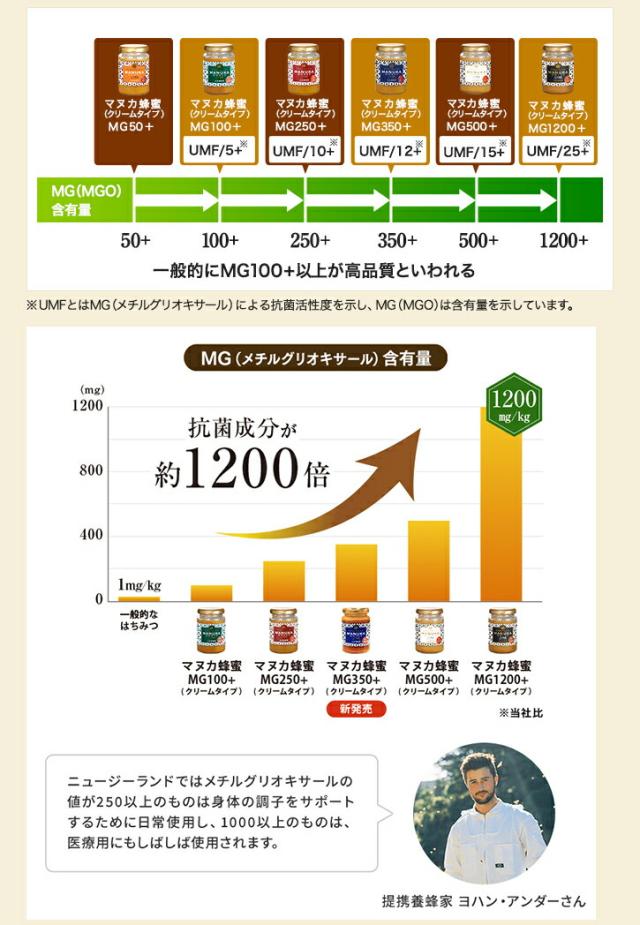 | 備考 | ■MG値について マヌカ蜂蜜の抗菌性(抗菌物質メチルグリオキサール)の指標です。 (例:MG100・・・はちみつ1kg中に100mgのメチルグリオキサールが含まれる) |