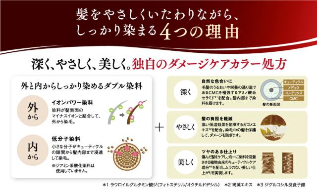 水/ミリスチルアルコール/水添ナタネ油アルコール/ステアルトリモニウムブロミド/ハチミツ/ローヤルゼリーエキス/ミツロウ/γ−ドコサラクトン/アストロカリウムムルムル種子脂/カカオ脂/テオブロマグランジフロルム種子脂/褐藻エキス/セラミドNP/ジグルコシル没食子酸/プセウドジマエピコラ/(アルガニアスピノサ核油/ツバキ種子油/チャ種子油/ヒマワリ種子油/アーモンド油)発酵エキス液/ラウロイルグルタミン酸ジ(フィトステリル/オクチルドデシル)/加水分解コンキオリン/アロエベラ液汁/イソステアリン酸/イソステアロイル加水分解コラーゲン/イソプロパノール/イソロイシン/エタノールアミン/BG/エンピツビャクシン油/オレンジ果皮油/クエン酸/グルタミン酸/クロルヒドロキシAl/サトウカエデ樹液/ステアリン酸グリコール/セテス−40/トリ(カプリル酸/カプリン酸)グリセリル/バリン/ヒドロキシエチルセルロース/フェノキシエタノール/ペンチレングリコール/ホホバ種子油/ポリクオタニウム−7/メチオニン/ユズ果皮油/炭酸水素アンモニウム/(+/−)HC青2/塩基性茶16/塩基性青99/塩基性黄87/HC黄4/塩基性橙31