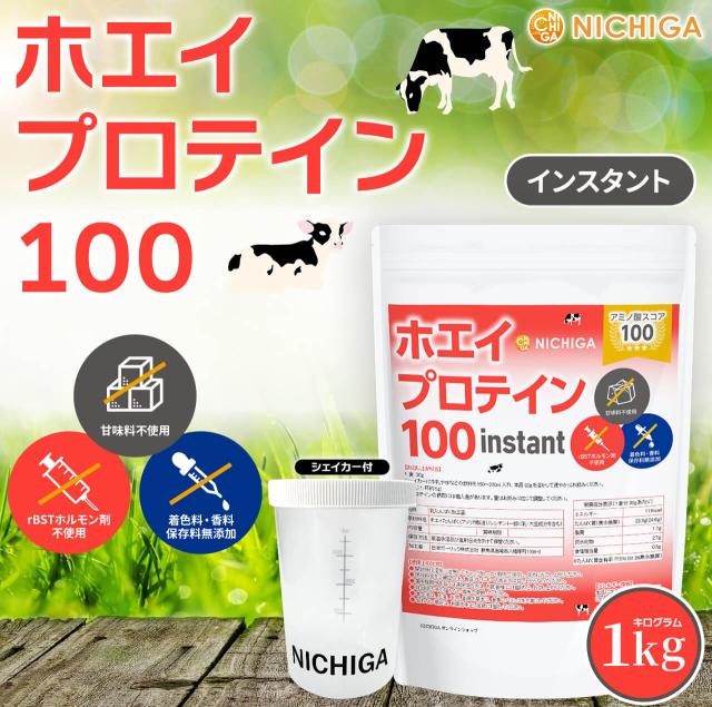 <シェイカー セット> ホエイプロテイン100 【instant】 1kg【送料無料(沖縄を除く)】 プレーン味 rBST (牛成長ホルモン剤不使用) WPC 溶けやすい造粒品 NICHIGA(ニチガ) TK1