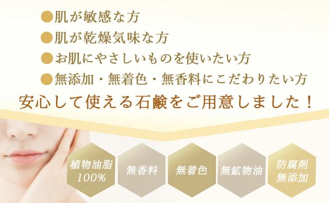 無香料、無着色、無鉱物油、防腐剤無添加のお肌にやさしい全身用石鹸