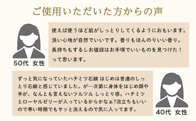 | 原材料・成分 | 石けん素地・はちみつ・エチドロン酸・ローヤルゼリー・酸化チタン |