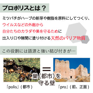 ![]() 天然のバリア成分「プロポリス」 ミツバチが樹脂や植物の新芽などから作るプロポリスには、外敵から自分や巣を守ったりするチカラが。桂皮酸誘導体(アルテピリンC、p-クマル酸など)、フラボノイドをはじめ、各種ビタミン類、ミネラルなどの有用成分を含んでおり人間の健康維持に役立つことが知られています。 |