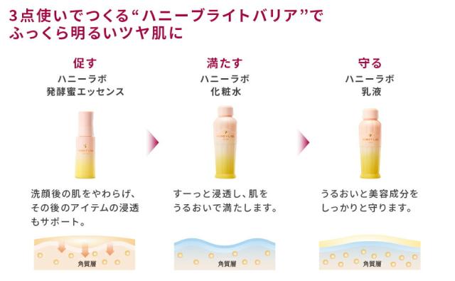 【3点ライン使いで作るハニーブライドバリア】![]() ハニーラボスキンケアを実感するなら、まずは基本3点で。 |