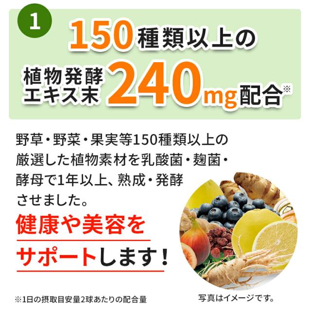 150種類もの厳選した植物素材を発酵させたエキスをギュッと凝縮しました。 さらに、植物性乳酸菌450億個、食事のサポート成分であるガルシニアエキス末10mg配合。