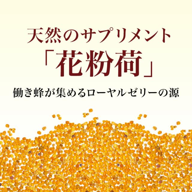 花粉荷が持っている豊富な栄養素をスムーズに摂取できるように、硬い細胞壁を破砕し、粉末状にした原料を粒タイプに仕上げました。花粉荷そのものの豊かな香りをお楽しみいただけるとともに、噛んでもおいしくお召し上がりいただけます。