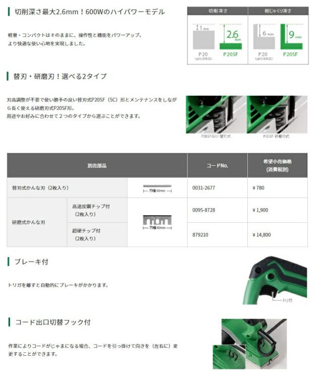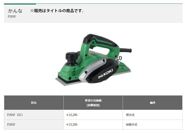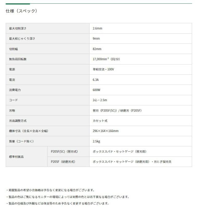 HiKOKI カンナ P20SF 研磨刃式 深切削 コード出口切替フック付 工機ホールディングス 日立 ハイコーキ