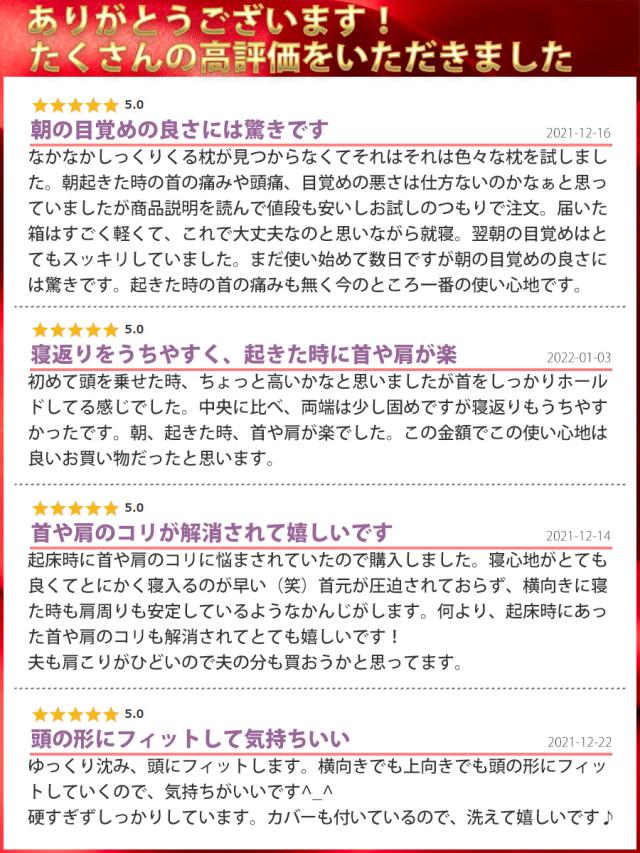 - 使い初めて初日から、寝起きの肩や首筋の重みがなく、とても軽かったです。長年、枕は合うものにめぐりあえず、あきらめていましたが、試しに購入してみたところ、思ってた以上に気持ちがよくて、驚きました。母にも...