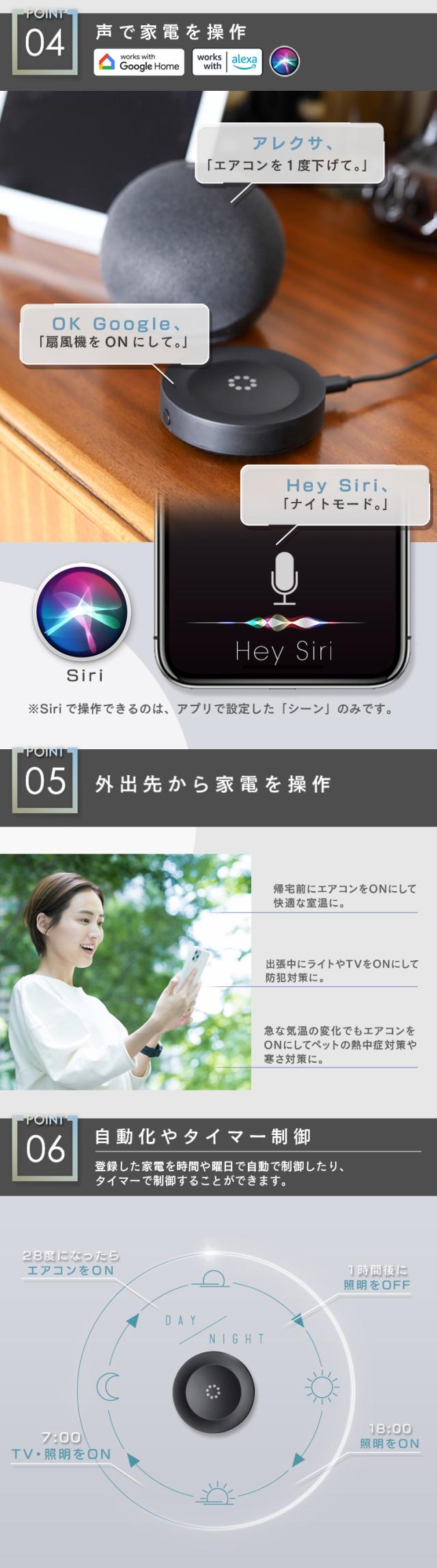 | 注意事項 | ※この製品・アプリは日本国内専用です。海外ではご使用になれません。 ※スマートリモコンに登録できるリモコンは「赤外線(IR)リモコン」のみです。「無線式(RF)リモコン」は登録できませんのでご注意ください。 ※赤外線リモコンでも機器の仕様により登録できない、または操作できない場合があります。予めご了承ください。 ※ストーブや電熱器など火災・感電・事故・傷害が発生する危険性がある家電製品には絶対に使用しないでください。 ※Wi-Fi環境、障害物、家電製品の状態などによりデバイスの確実な操作の保証はできかねます。また、遠隔操作に関しては、家電製品の動作を直接確認できないため、安全面を確保の上ご使用ください。誤作動や操作不能などにより発生した人身事故、ペットの事故、火災事故およびそれによって生じた損害に関して当社はいかなる責任も負いかねます。 ※スマートリモコンの有効距離は最大10m(半径)までですが、家電製品の受信性能や受信部の角度、また障害物の有無などによって操作できない場合があります。 ※別の部屋に設置している家電製品を操作することはできません。 その他Web取扱説明書をよくお読みの上ご使用ください。 |