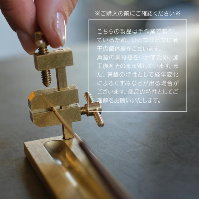 | 注意事項 | 【ご購入前にご確認ください】 こちらの製品は手作業で製作しているため、ひとつひとつに若干の個体差がございます。真鍮の素材感をいかすため、加工痕をそのまま残しています。また、真鍮の特性として経年変化によるくすみ等が出る場合がございます。商品の特性としてご理解をお願いいたします。 ●お香は付属しません。 ●小さなお子様の手の届くところでのご使用は危険ですのでおやめください。 ●安定した場所でご使用ください。 ●火を灯している間は、火事などに十分注意しご使用ください。 ●定期的に換気をし、長時間閉め切った場所でのご使用は避けてください。 |