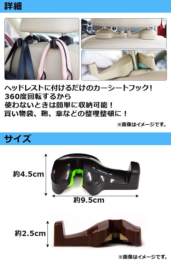 カーシートハンガー 車内用フック 車内用ハンガー ヘッドレストフック ヘッドレストハンガー フック ハンガー クリップ 袋掛け 買い物フック バッグホルダー バッグハンガー 車内 車載 多目的 多機能 収納 回転 360度 荷物 引っ掛け 袋 買い物 ショッピング 買い物袋 傘 バッグ カバン リュック 内装 インテリア 転倒防止 小物 シートポール ヘッドレスト 黒 茶色 motorcar オートモービル モーターカー カー 車 自動車 車両 4562430574354 4562430574347 4562430574361 BEIGE 茶 BROWN 461352410