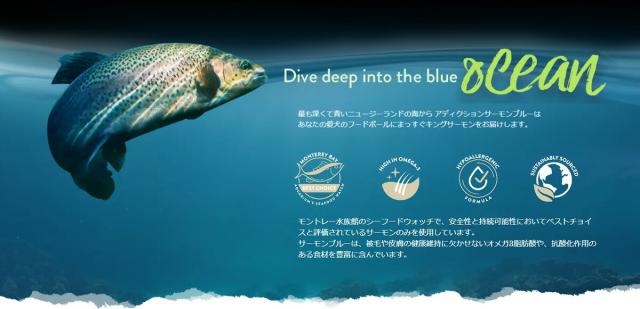 アディクションサーモンブルーは、全てのライフステージの愛犬が「Addiction(やみつき)」になり、家族みんなが喜びを感じられる食事の時間を贈ります。