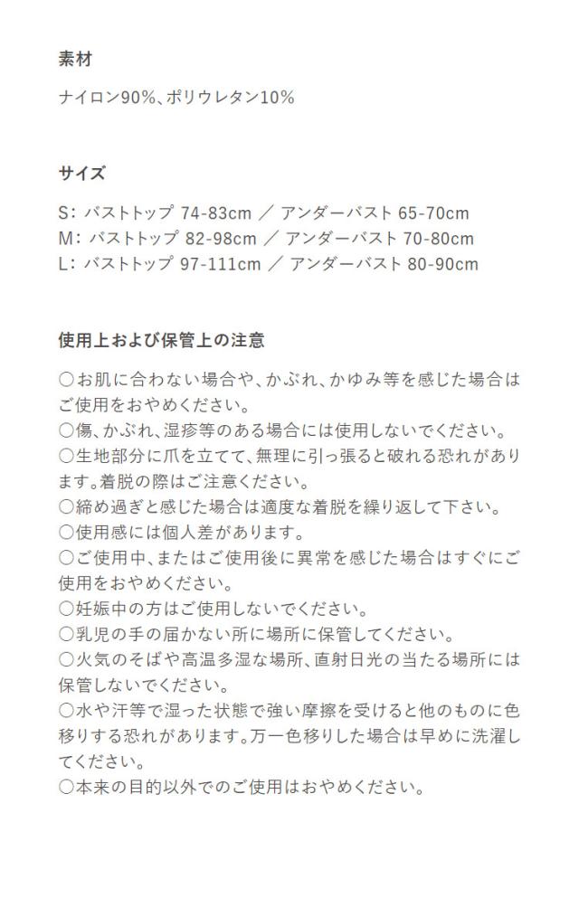 ・サイズS(トップ:74-83cm アンダー:65-70cm) ・サイズM(トップ:82-98cm アンダー:70-80cm) ・サイズL(トップ:97-111cm アンダー:80-90cm) |