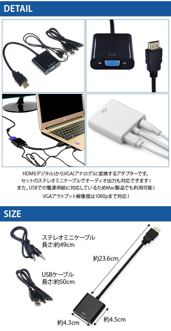 HDMI変換アダプター VGA変換アダプター 変換 ケーブル コネクター コネクタ アダプター アダプタ 端子 HDMI VGA ステレオケーブル オーディオケーブル ステレオ オーディオ USB プラズマテレビ 液晶テレビ 薄型テレビ テレビ パソコン PC ディスプレイ モニター プロジェクター ゲーム機 DVD HD ハードディスク BD ブルーレイ レコーダー デジタル機器 PC周辺機器 MAC マック 入力 出力 データ 映像 ビデオ AV デジタル アナログ コンバート 補給 充電 電源供給 電力供給 電源 電力 供給