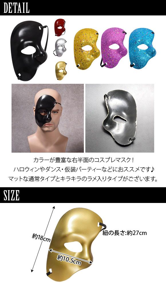 カラーが豊富な右半面のコスプレマスク!