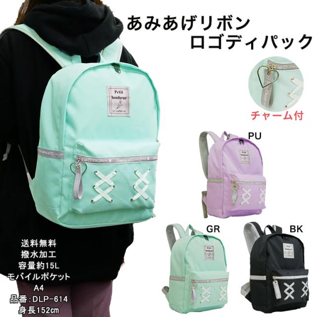 バッグ リュック ディパック あみあげリボン チャーム付 A4 撥水 モバイルポケット タブレット ギガスクール Dカン ロゴネーム 背面メッシュ素材 容量約15L 通学 旅行 おでかけ 校外学習 遠足 買い物 小学生 低学年 学校 プレゼント 背面メッシュ素材 女の子 子ども DLP-614
