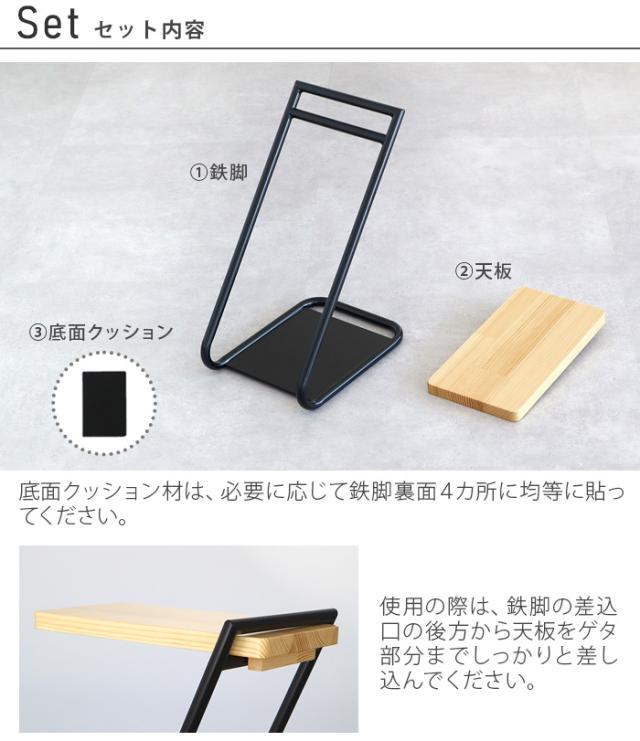 | 組み立て式です。(工具不要) 底面クッション材は、必要に応じて鉄脚裏面4カ所に均等に貼ってください。 ご使用の際は、鉄脚の差し込み口の後方から天板をゲタ部分まで差し込んでください。天板がしっかりと奥まで差し込まれているかご確認のうえ、ご使用ください。 |