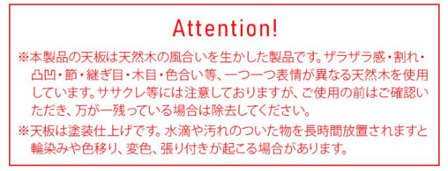 | 本来の用途以外に使用しないでください。 サイズ、重量などの数値には若干の個体差があります。 本製品の天板は天然木の風合いを生かした製品です。ザラザラ感・割れ・凸凹・節・継ぎ目・木目・色合い等、一つ一つ表情が異なる天然木を使用しています。ササクレ等には注意しておりますが、ご使用の前はご確認いただき、万が一残っている場合は除去してください。 天板は塗装仕上げです。水滴や汚れの付いた物を長時間放置されますと輪染みや色移り、変色、張り付きが起こる場合があります。 耐荷重制限を超えて物を載せないでください。 製品に乗ったり、腰かけたりしないでください。立ち上がる際に体重をかけたり、偏った荷重をかけないでください。転倒によるケガや破損など、大きな事故につながるおそれがあります。 移動の際は天板が外れるおそれがありますので、取り扱いに注意してください。天板を持ったり、天板や土台部分に荷物を載せたまま移動しないでください。 傾斜した場所や、下が柔らかい場所など、不安定な場所には設置しないでください。転倒してケガをしたり、荷物の落下の原因となります。 |