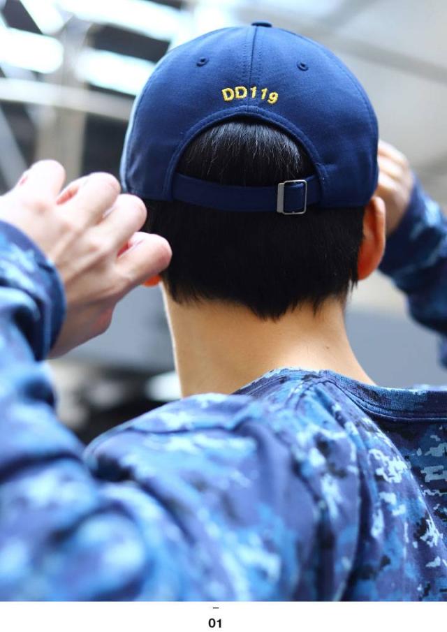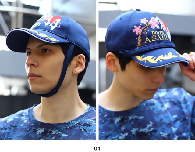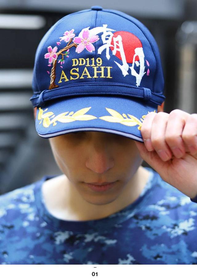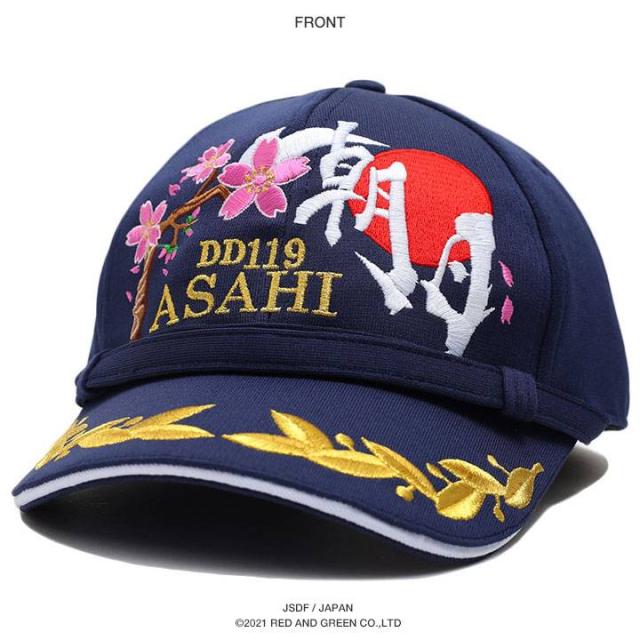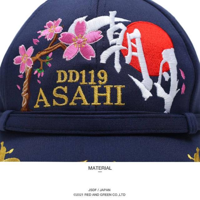 正面に、金糸刺繍で英艦名の「JS ASAHI/DD119」、白糸刺繍で「朝日」、赤糸刺繍で「日の丸(日章)」、ピンク糸刺繍で「桜」、バックパネルにはDD119のアーチロゴ刺繍入り。