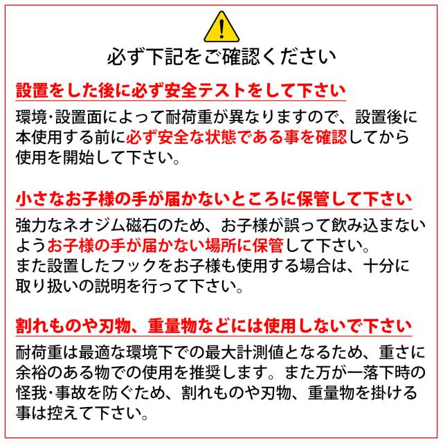 【製品情報】個数:5個セットサイズ:高さ「約3.5cm」×直径「約1.6cm」重量:約11g (1個あたり)素材:ネオジム磁石・鉄耐荷重:垂直設置「約9kgまで」 / 平行設置「約2kgまで」 【備考】※商品の入荷・製造時期などにより、同じ商品でも一部設計変更がされる場合がございます。※製造工程での鉄の型取りや接合処理などの関係上、細かい傷や接続処理時の痕がある場合がございますが、こちらは仕様となります。※非常に強力なネオジム磁石を使用していますので、磁気カードやICカードを磁石付近に近づけないでください。磁力により故障やICチップが読み取り不可などの原因となります