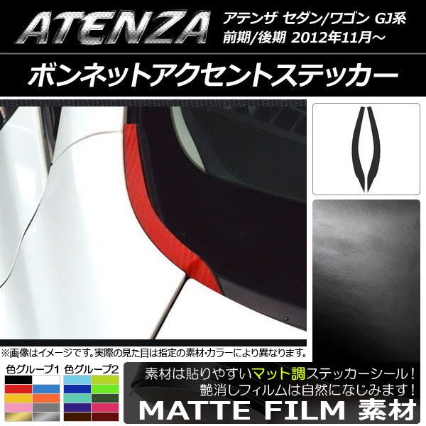 ボンネットアクセントステッカー マット調 マツダ アテンザセダン/ワゴン GJ系 前期/後期 色グループ2 入数:1セット(2枚) AP-CFMT1681 色グループ2: パープル ブラウン ボルドー マゼンタ ダークグリーン ダークブルー ライトイエロー ライトグリーン ライトブルー シアン