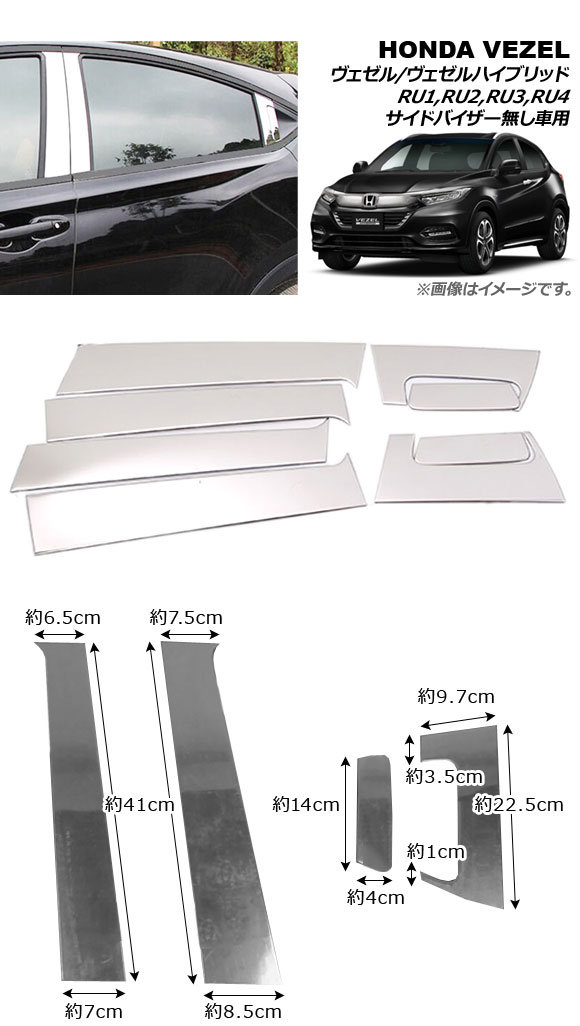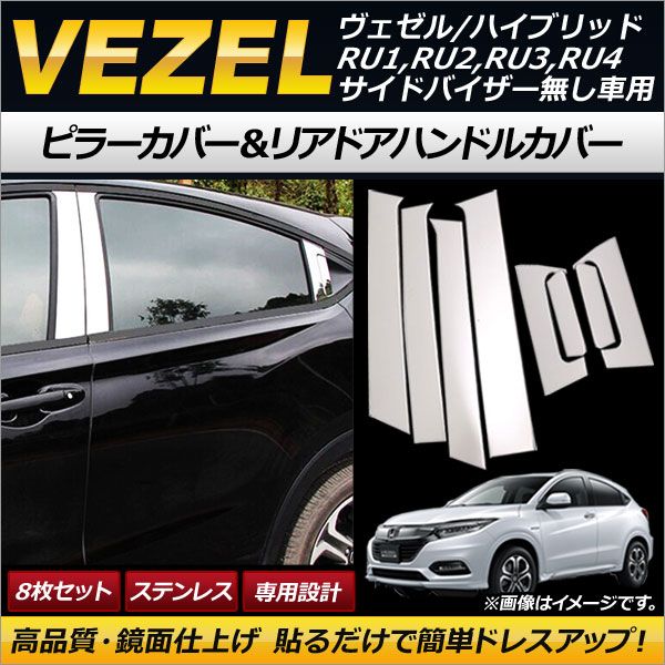 ピラーカバー&リアドアハンドルカバー ホンダ ヴェゼル/ハイブリッド RU1,RU2,RU3,RU4 サイドバイザー無し車用 2013年12月〜 ステンレス AP-XT239 入数:1セット(8個)