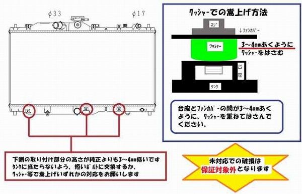 ※下側タンクファンカバーの取り付け高さが純正よりも3〜4ミリ低いため、短いボルトへ交換かワッシャー等で嵩上げ対応が必要です。未対応での破損は保証対象外となります。