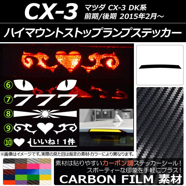 ハイマウントストップランプステッカー カーボン調 マツダ CX-3 DK系 前期/後期 2015年02月〜 選べる20カラー タイプグループ2 AP-CF3372 カラー: ブラック ホワイト レッド ブルー イエロー グリーン オレンジ パープル ピンク ネイビー ブラウン ボルドー クリア ゴールド シルバー ガンメタリック マゼンタ ダークグリーン メタリックブルー ライトブルー