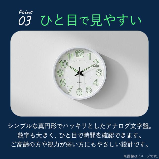 | 商品説明 | ・夜もくっきりと浮かびあがる見やすい文字盤!夜光性ウォールクロックが新登場。 ・すっきりとシンプルな真円形に、大きな数字フォントを並べた視認性抜群のアナログ文字盤を採用。 ・文字盤の数字や時針・分針は蓄光塗料で仕上げ、夜間・電気を消した暗い部屋でも時間がひと目で確認できる!お子さまやお年を召した方に優しいデザインが魅力。 ・真っ白な文字盤には分刻みの目盛りも配置され、お子さまの「時計の読み方学習」にも大活躍! ・スムーズに動く静音連続秒針を採用し、就寝中や学習中に秒針のチクタク音が気になる方でも安心。 ・モノトーンのクールな色使いがお部屋の雰囲気に素敵にマッチ♪リビングや子ども部屋にはもちろん、テレワーク用の書斎にもオススメ。 ・単3形マンガン乾電池1個使用。(電池は別売りです。) |