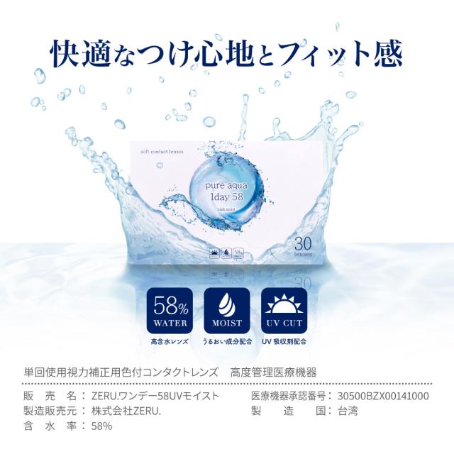 2箱セット コンタクトレンズ ワンデー 30枚 ピュアアクアワンデー UV Moist 58 by ZERU 高含水 58% 1箱 30枚入 1日使い捨て Pure aqua 1day ゼル クリアコンタクト ソフトコンタクト UV加工 モイスト