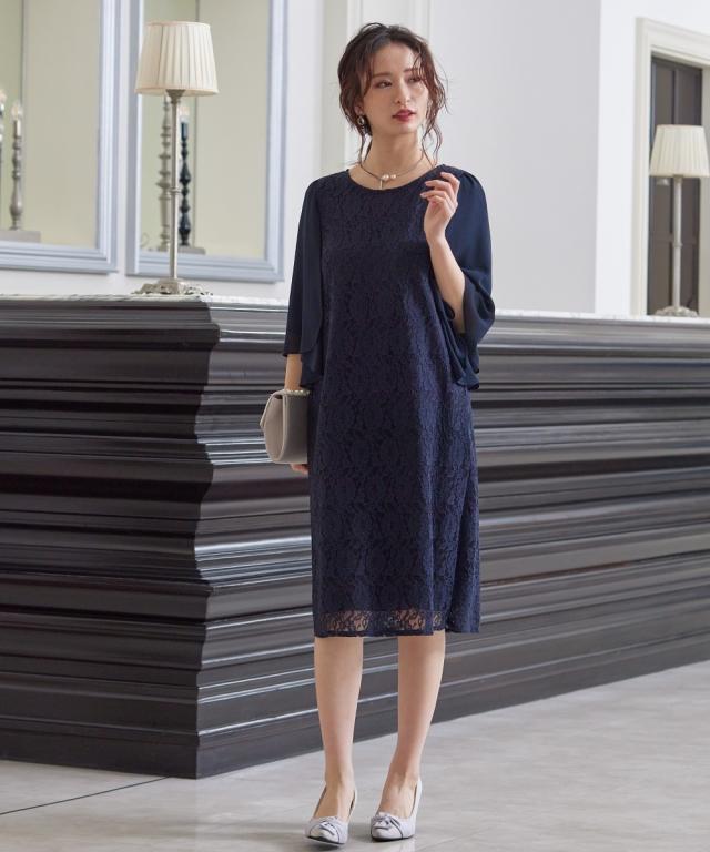 ドレス ワンピース レディース 結婚式 パーティー シフォン フレア袖 デザイン レース サック ネイビー/ブルーグレー M/L ニッセン nissen