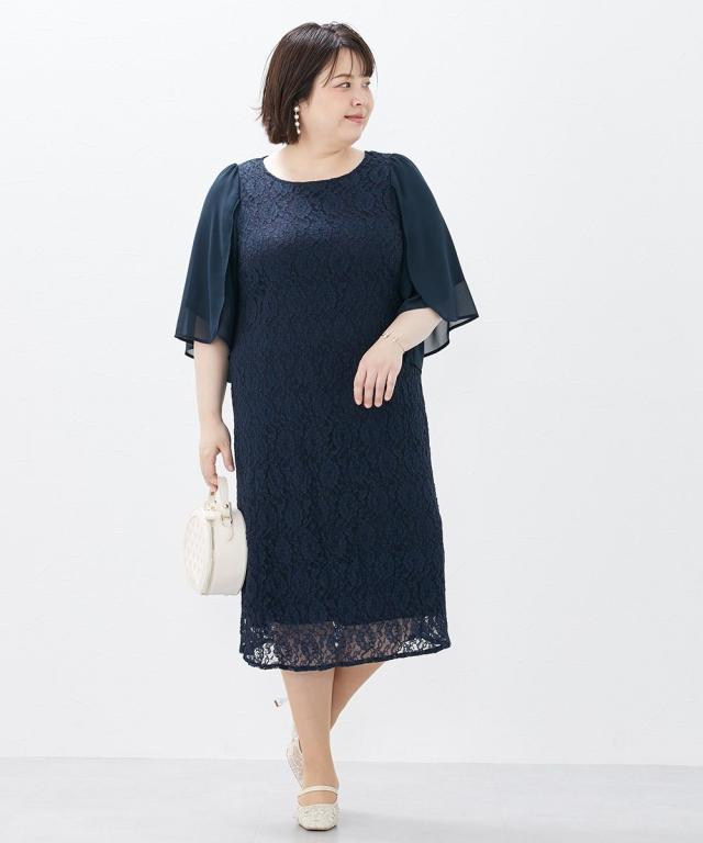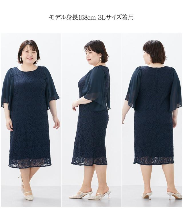 ドレス ワンピース レディース 結婚式 パーティー シフォン フレア袖 デザイン レース サック ネイビー/ブルーグレー LL/3L ニッセン nissen