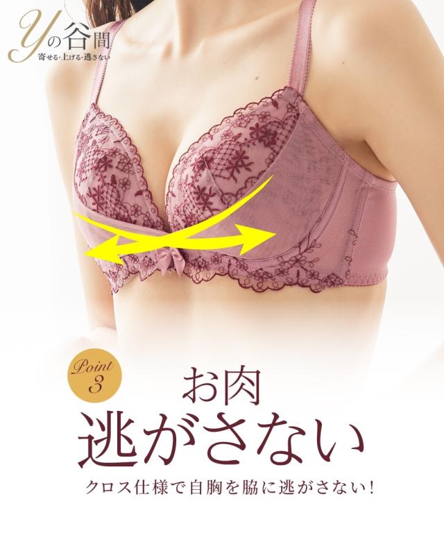 トリンプとニッセンの共同企画から新しい谷間の形をご提案!下垂したバストも脇に流れやすいバストもYの谷間をつくるブラジャーにお任せ!寄せパターンと前の低いワイヤーで前が痛くなりにくく、きれいな谷間をジャマしない。カップ上辺のパカパカはカップ脇生地でしっかり引き上げる。すぐに逃げるバストも前のクロス生地が逃がさずにホールド!上ふっくら、縦にスー!きれいなYの谷が長時間続きます。ショーツはストレッチ素材でお尻にフィット。脚口もレースでアウターに響きにくい。コーディネートして履いてほしいこだわりです。